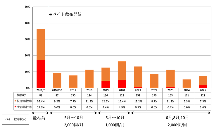鹿追町では、ベイト散布前の平成28年5月に野外キツネのエキノコックス感染状況の予備調査を行った結果に比べ、ベイト散布後は抗原陽性・虫卵陽性が大幅に減り、感染率が低減したことがわかっております。