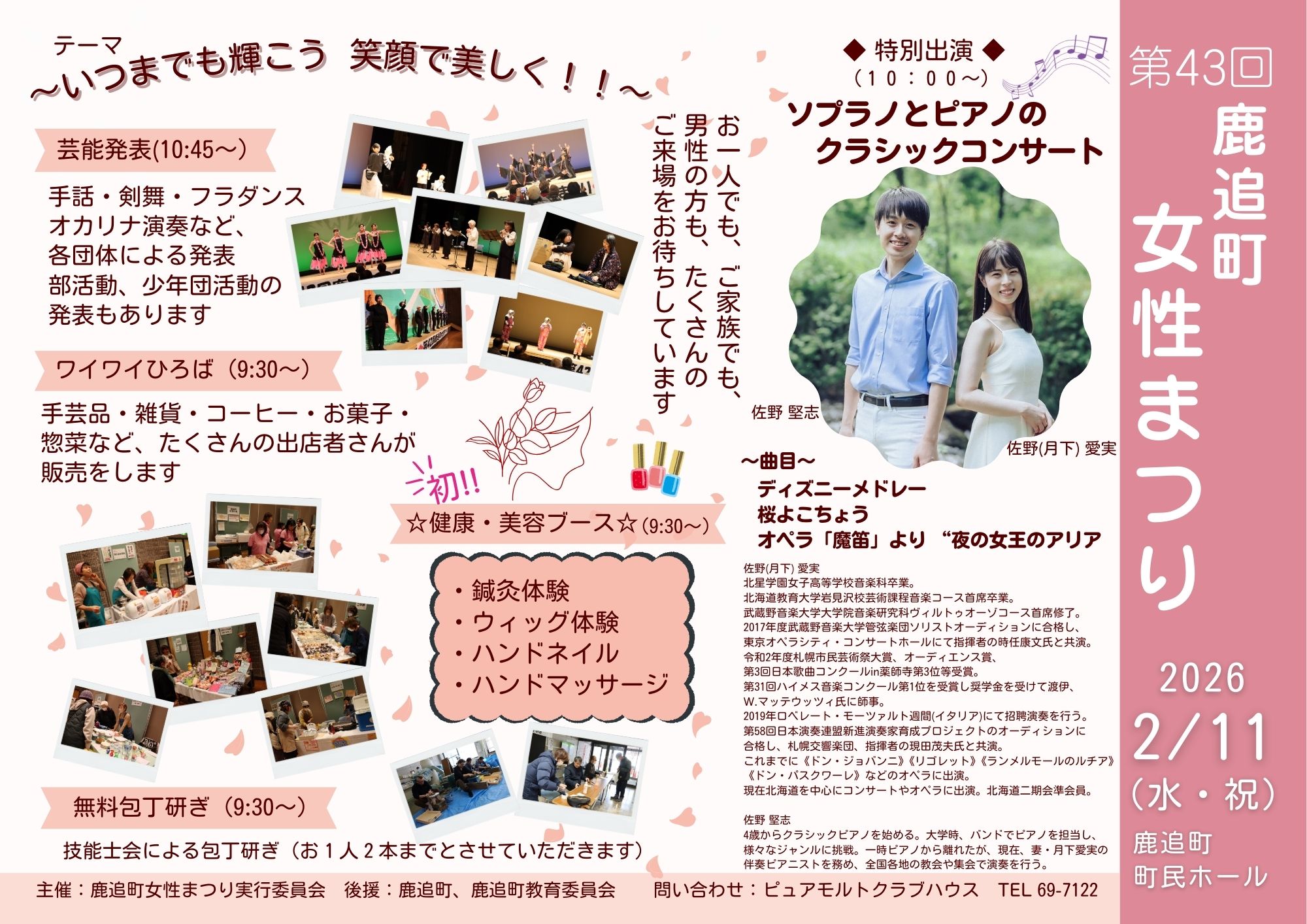 令和8年2月11日(水・祝)に鹿追町民ホールにて「第43回鹿追町女性まつり」を実施いたします。