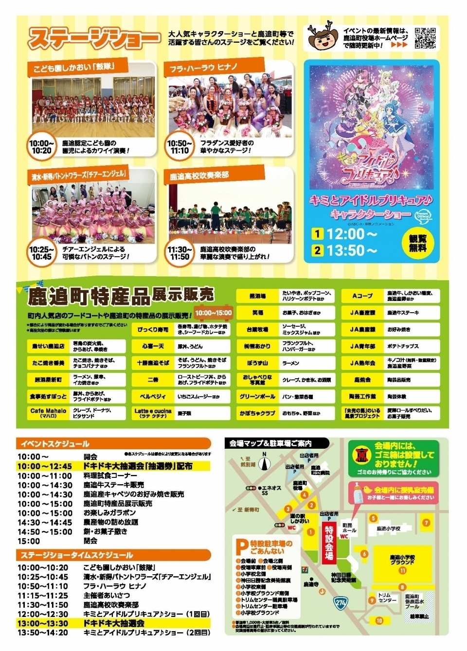ステージイベントは、こども園しかおいの鼓隊など4団体による演奏・ダンスに加え、「キミとアイドルプリキュア♪」キャラクターショーが行われます。
