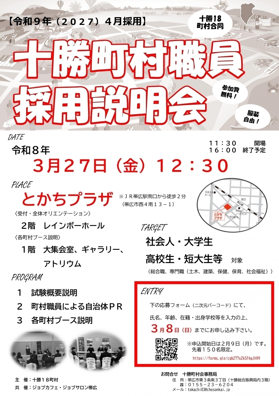 十勝18町村合同 十勝町村職員採用説明会【3月27日(金)】を開催します。 2026年2月9日(月) 総務課 申込期限 :3月8日(日)までにお申し込み下さい。※先着150名限定申込先URL:https://forms.gle/paKKSiyFrdGPQGNz9【問い合わせ先】十勝町村会事務局☎0155-23-6204 このページの情報に関するお問い合わせ先 総務課 職員係TEL:0156-66-2311FAX:0156-66-1020