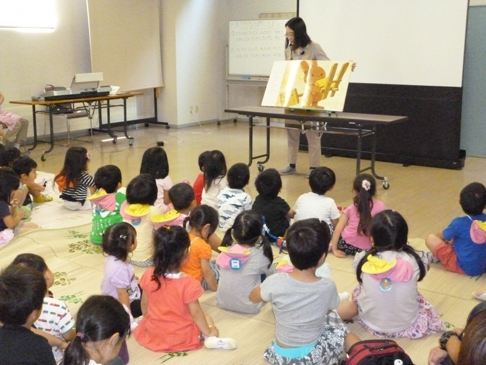 図書館職員が大型絵本「おこだでませんように」「どうぞのいす」と、「たなばたさま」の絵本の読み聞かせを行いました。
