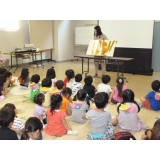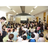 続いての大型絵本の読み聞かせは「すてきな三人ぐみ」を日本語と英語で聞き比べてもらいました。