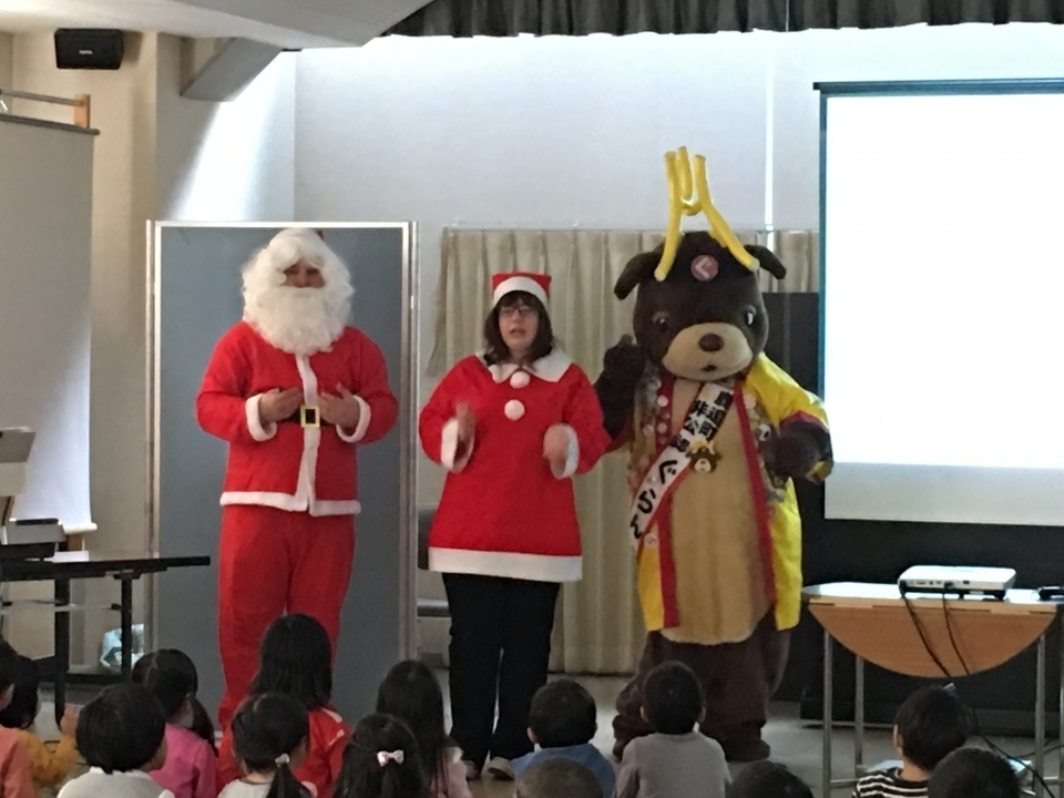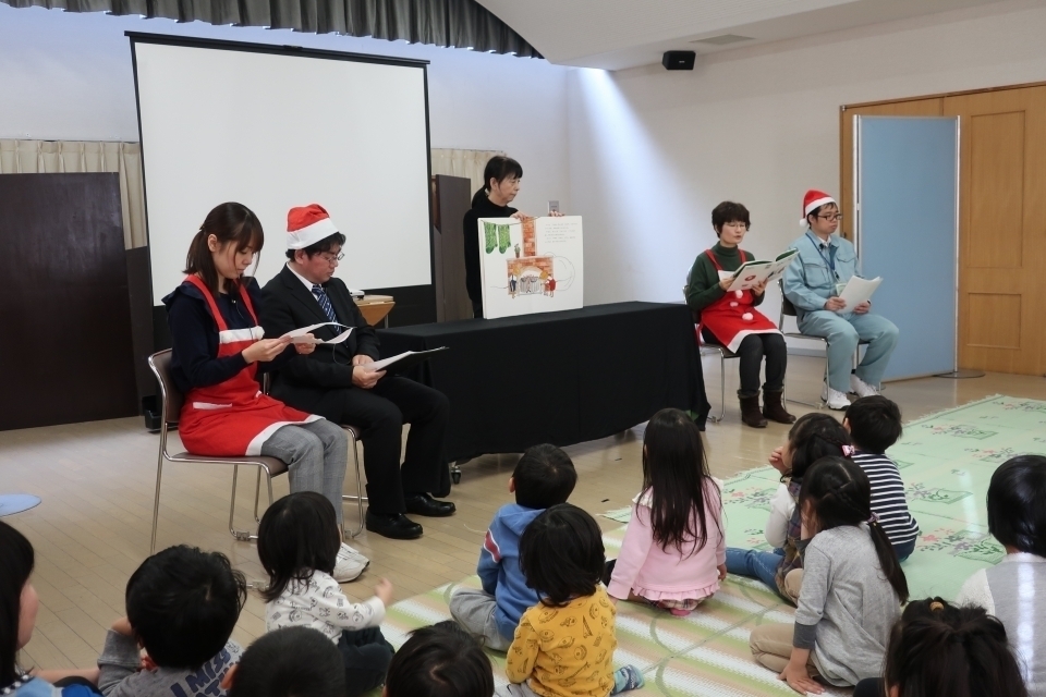 図書館では子どもたちが行事に親しみ、読み聞かせを通して本の世界の楽しさを知ってもらうためにさまざまなイベントを実施しています。その1つである「クリスマス会」を町民ホールにて行いました。