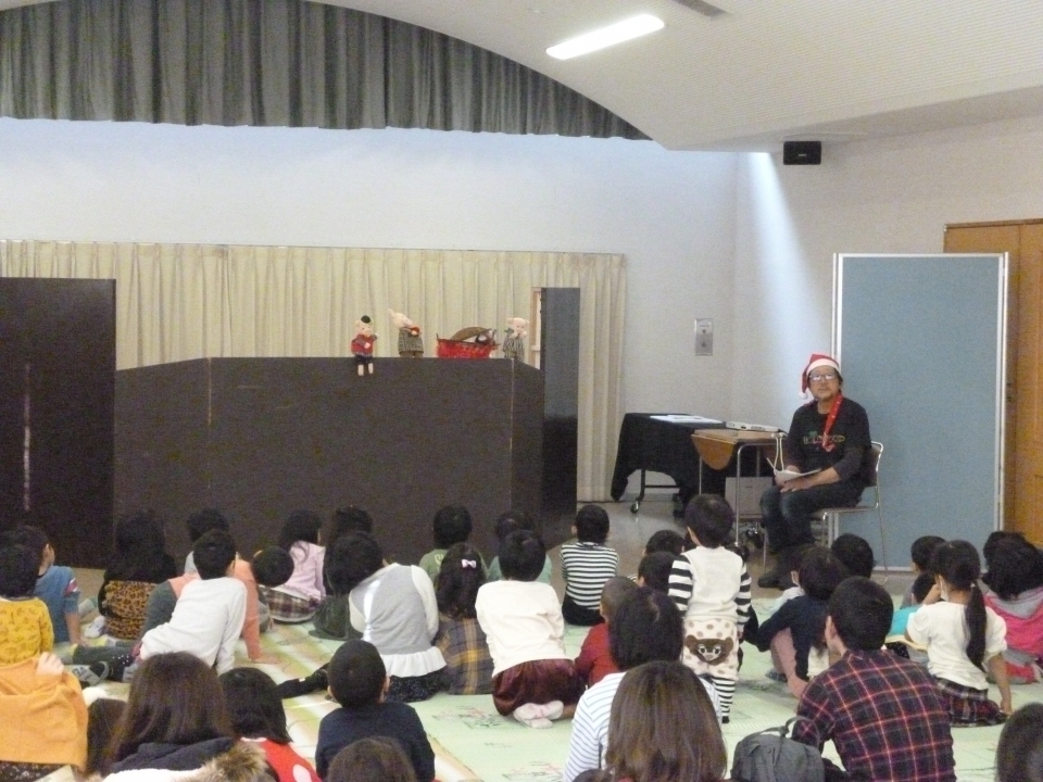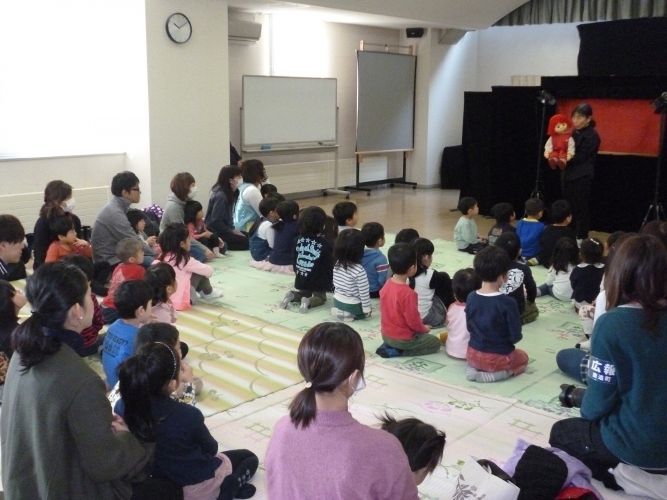職員の読み聞かせ「ぐりとぐらのおきゃくさま」の後は、ボランティアサークルもみじさんによる人形劇「3匹のこぶた」を行いました。オオカミの登場でみんな盛り上がりました。