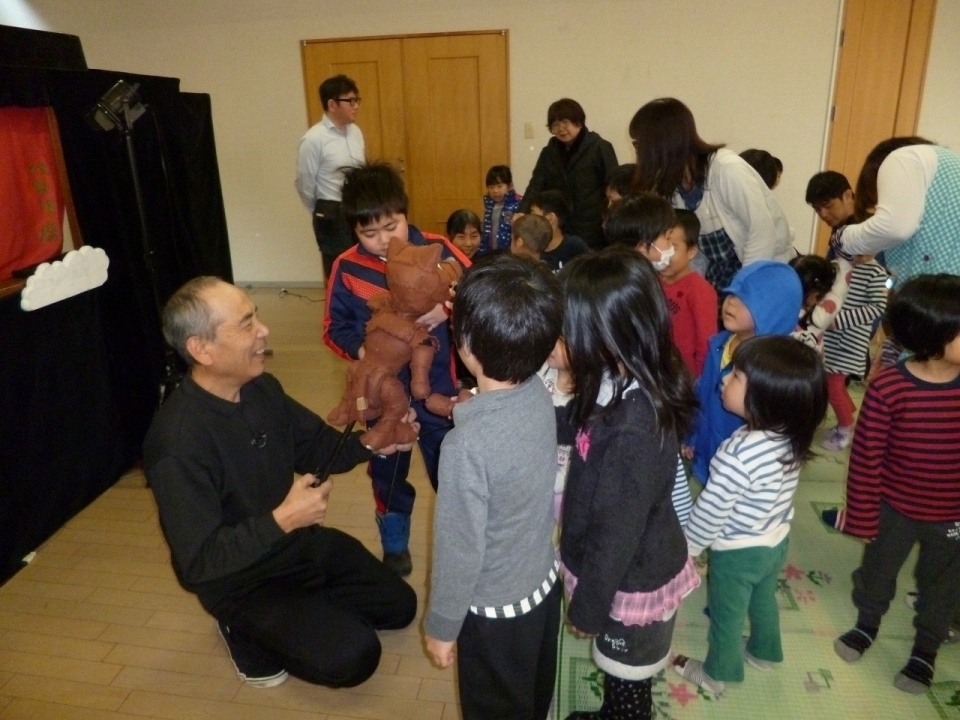 最後に子ども達は、腹話術人形のタナちゃんや「3匹のこぶた」のおおかみとふれあってお別れをしました。